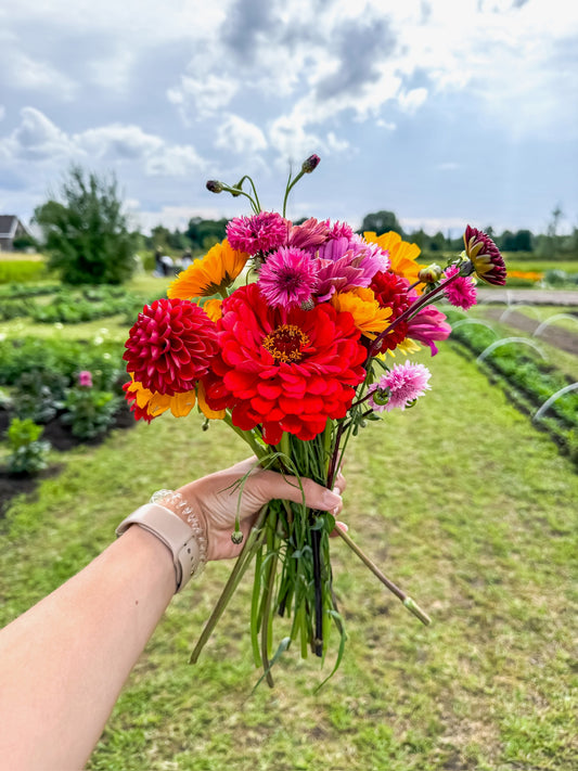Kom genieten op onze weelderige bloemenweide tussen de felle kleuren midden in de natuur. Ons bloeiseizoen start al in maart en loopt tot de eerste vorst in november. Plukken kan elke dag van zonsopgang tot zonsondergang, wanneer je maar wil dus! Het enige wat jij moet doen, is een snoeischaartje en vaasje meebrengen, wij zorgen voor de rest!